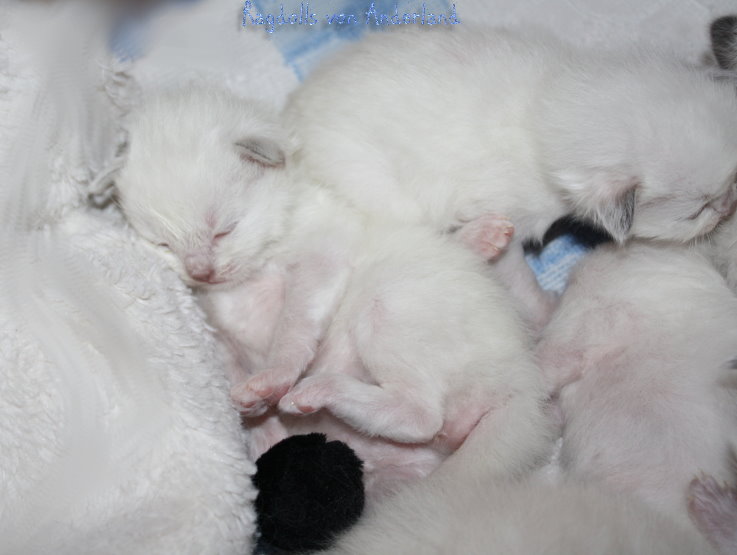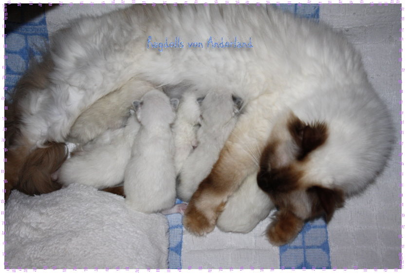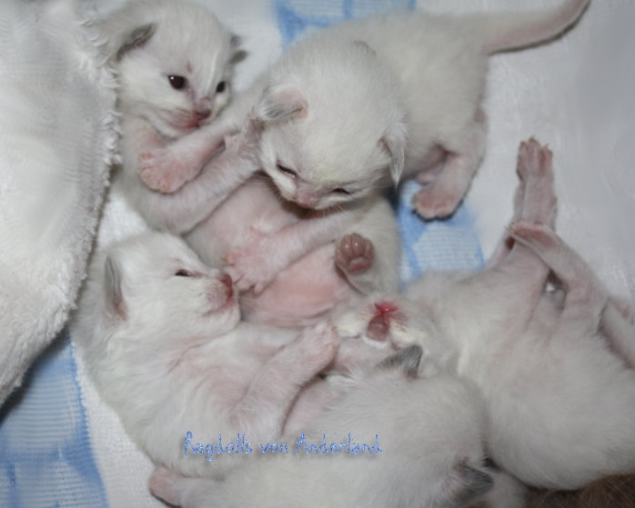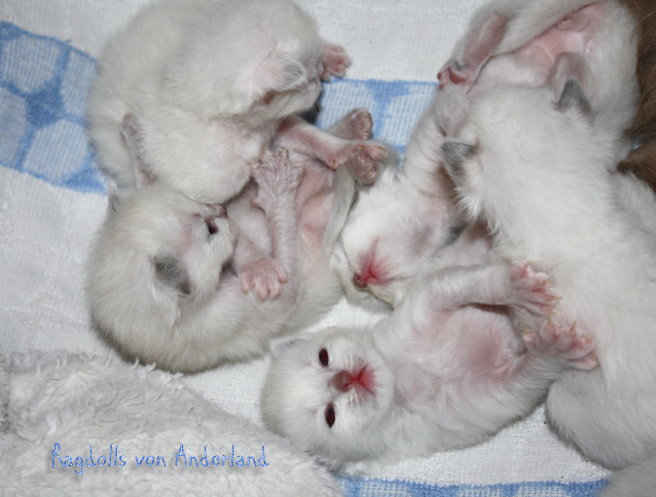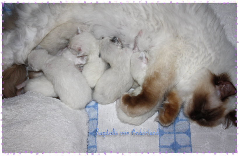 ....Wir freuen uns SEHR über: Einen Lilac- Colourpoint- u. - Mitted- Junge, einen Choco- Colourpoint- Junge, einen Blue- Colourpoint- Junge, ausserdem ein Blue- , ein Chocolate- sowie ein Seal- Mitted- Mädelchen. Alle wachsen und gedeihen ganz wunderbar..!!! ...Hier kommen ein paar Bilder im Alter von 10 Tagen: Naja, eigentlich Schnappschüsse..:-) - Es muss in diesem Alter noch schnell gehen, man will Mama und Kitten nicht unnötig aufregen, aber ich finde, ein bißchen sieht man doch schon von den Süßen..:-)! ![]() ...Wir